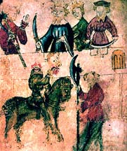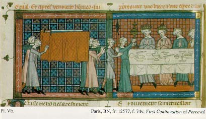 The first work to introduce this (totally fabricated) story was Geoffrey of Monmouth's History of the King's of Britain (1136), which was presented as a serious, scholarly work, and thus written down in LATIN--the language of knowledge, culture and "Authority." Geoffrey begins his History with Brutus, and continues down to the Anglo-Norman Kings. He mentions--almost in passing--a certain war-lord named "Arthur" who helped to organize British resistance against the Anglo-Saxon invaders after the fall of the Roman Empire (some time in the 6th century). Interestingly enough, one of Arthur's exploits was said to be conquering Rome (see Norton Anthology of English Literature, 6th ed., vol. 1, p. 6)--thus Arthur's descendants (the English kings) can claim NOT to owe allegiance to the French Kings, since the French claim to political legitimacy is rooted in their descendancy from Rome (via the Holy Roman Empire). Since "Arthur" had conquered Rome, Rome's descendants (France) could not claim control over Arthur's descendants (Anglo-Norman England). The rivality between the English people's "new" hero, Arthur, and the French people's national hero, the emperor Charlemagne, also accounts for the development of the story of Arthur's Round Table--a fellowship of Knights modelled on Charlemagne's traditional group of warrior followers, the twelve "peers."